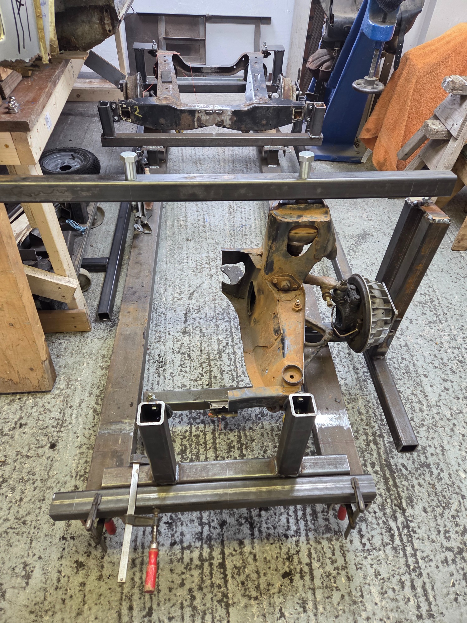 Front drivers side suspension mounted on chassis jig
