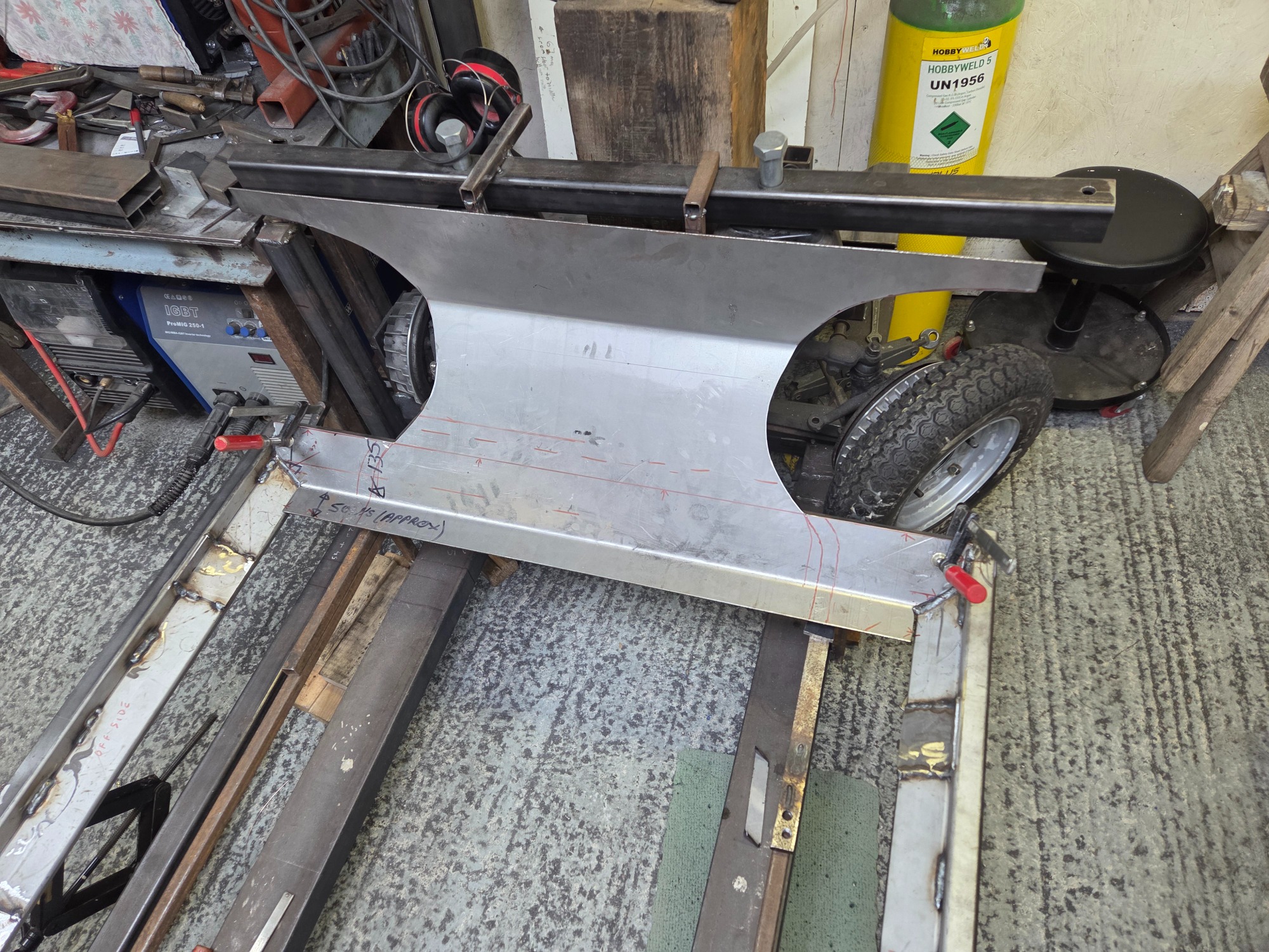 Middle chassis section beginning to be fabricated. This shows the complicated angles at the front toe board & wheel arch intersection.